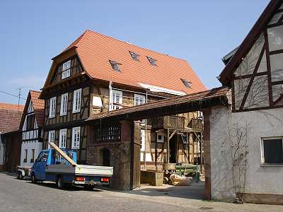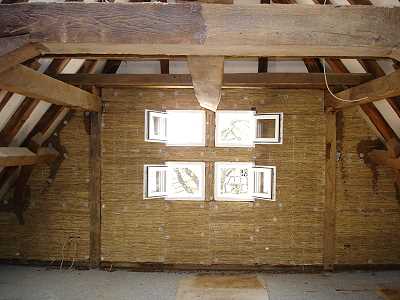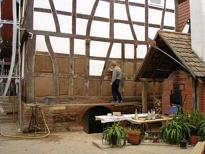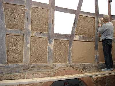 Das Anwesen Bohlender in Steinweiler mit Fachwerk aus dem 18. Jahrhundert. Eine Schilfinnendämmung auf der Außenwand als Untergrund für eine Wandheizung.