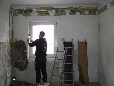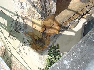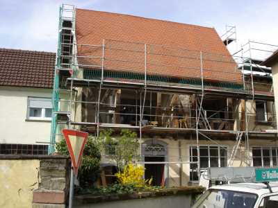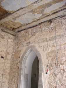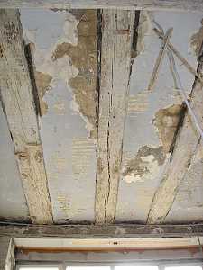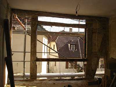 Wachenheim, Langgasse. Renaissancefassade freigelegt. Man sieht die Zerstörung der Balken durch Feuchtigkeit. Entkernung des Fachwerks. Ein spätgotischer Innenraum ist zu sehen (Form der Tür) und die historische Deckenbemalung (schwarze Linien links und rechts der Deckenbalken um sie wuchtiger wirken zu lassen).