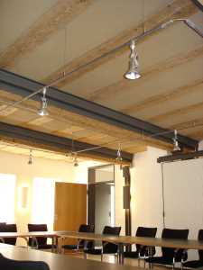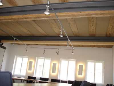 Restauration der Ratssaaldecke. Deckenlehmputz bleibt ungestrichen als Kontrast zu den modernen Wänden.